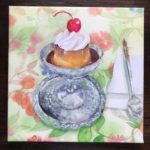 22cm×22cmのパネルに、水張りしたアルシュ紙に描きました。 たっぷりのクリームと真っ赤なチェリーでおめかししたレトロなプリン。 ステンレスの器やスプーン、どこも可愛いポイントです。 こちらは、写真のままのお渡しになります。 作品保護の為の布袋にお入れして発送致します。 自然光で撮影しており、実物に近いお色の写真を使っておりますが、 実物を実際に見て頂けない為、よくよくお考えの上、ご購入下さい。 透明水彩画となりますので、直射日光の当たる場所や強い光のあたる場所は 避けてお飾り下さい。