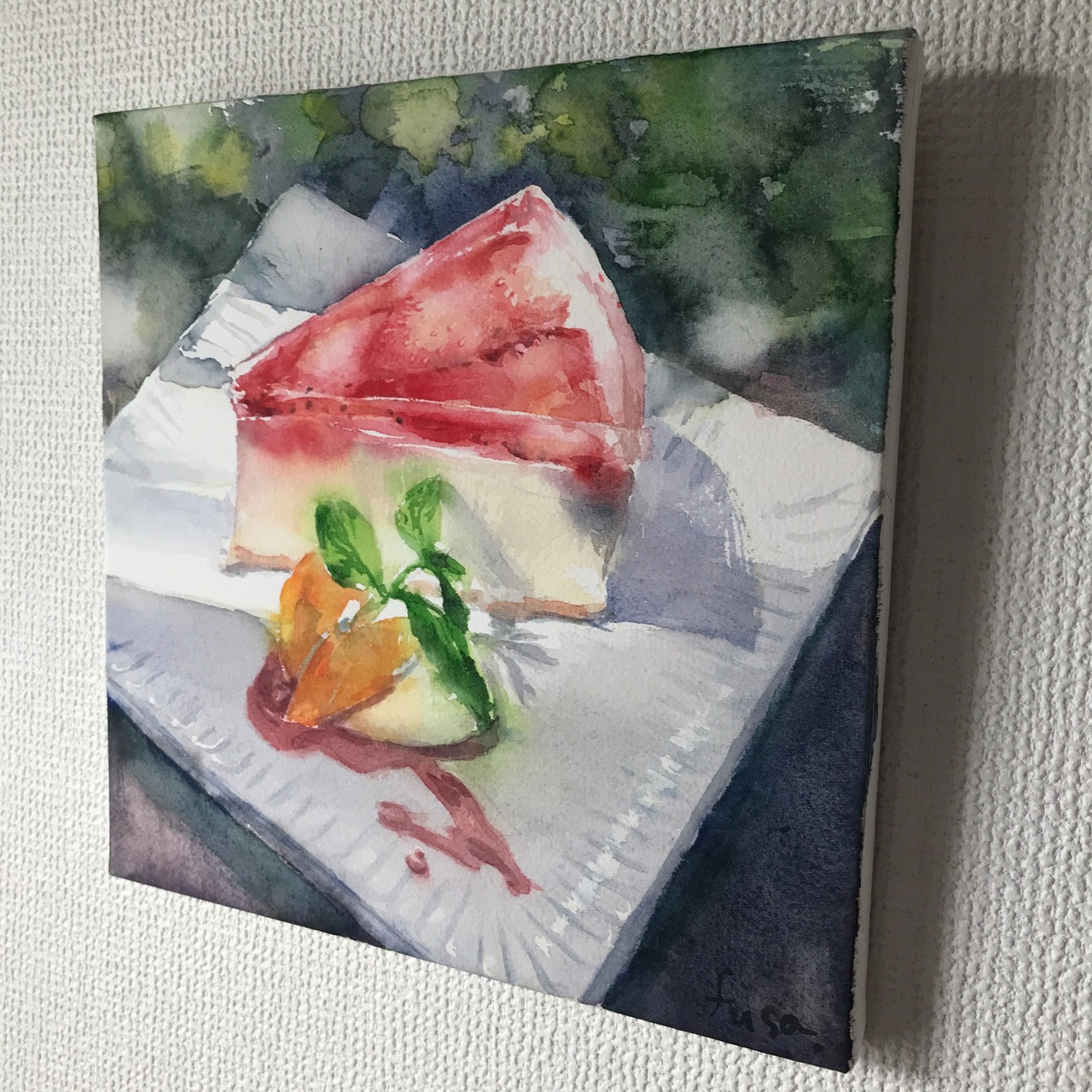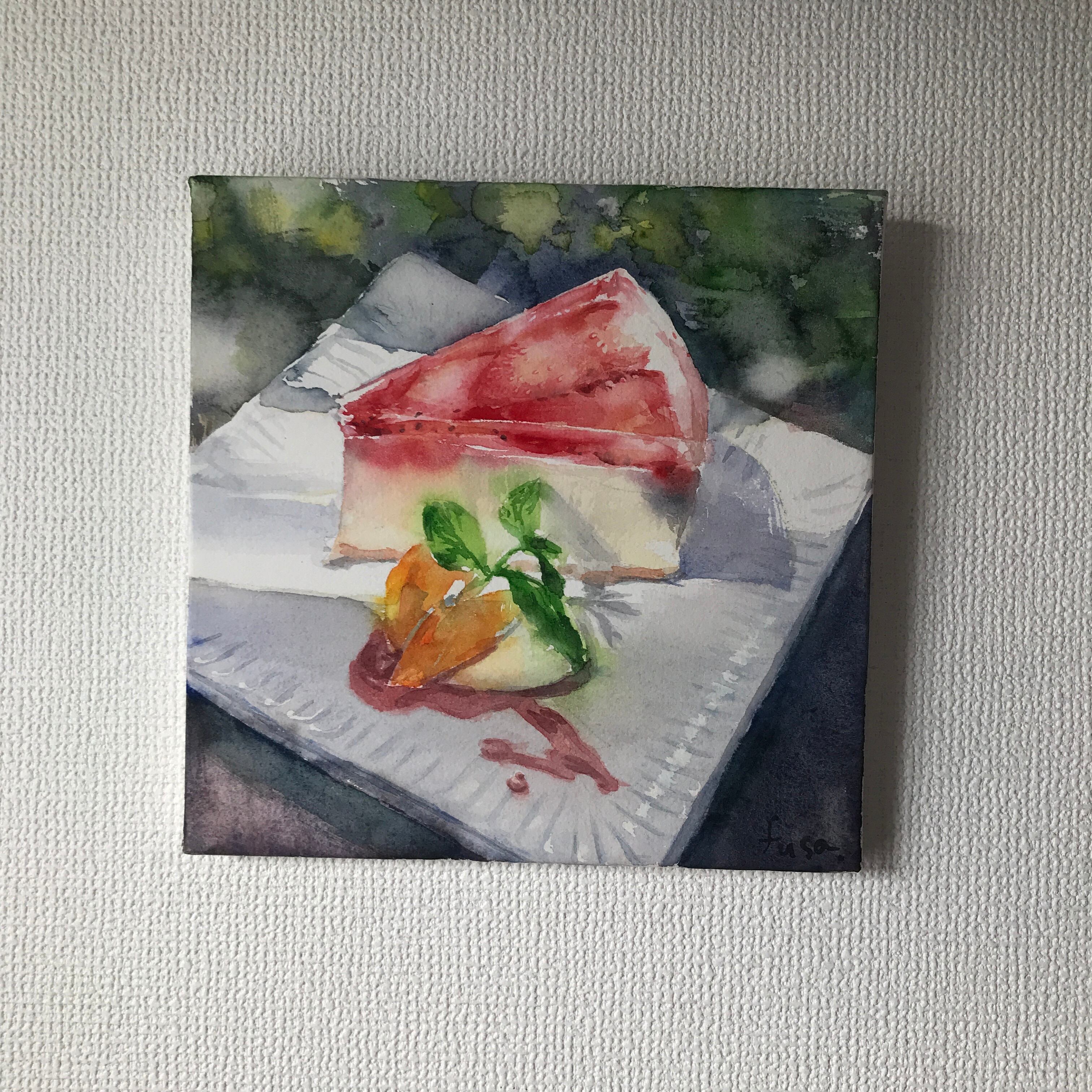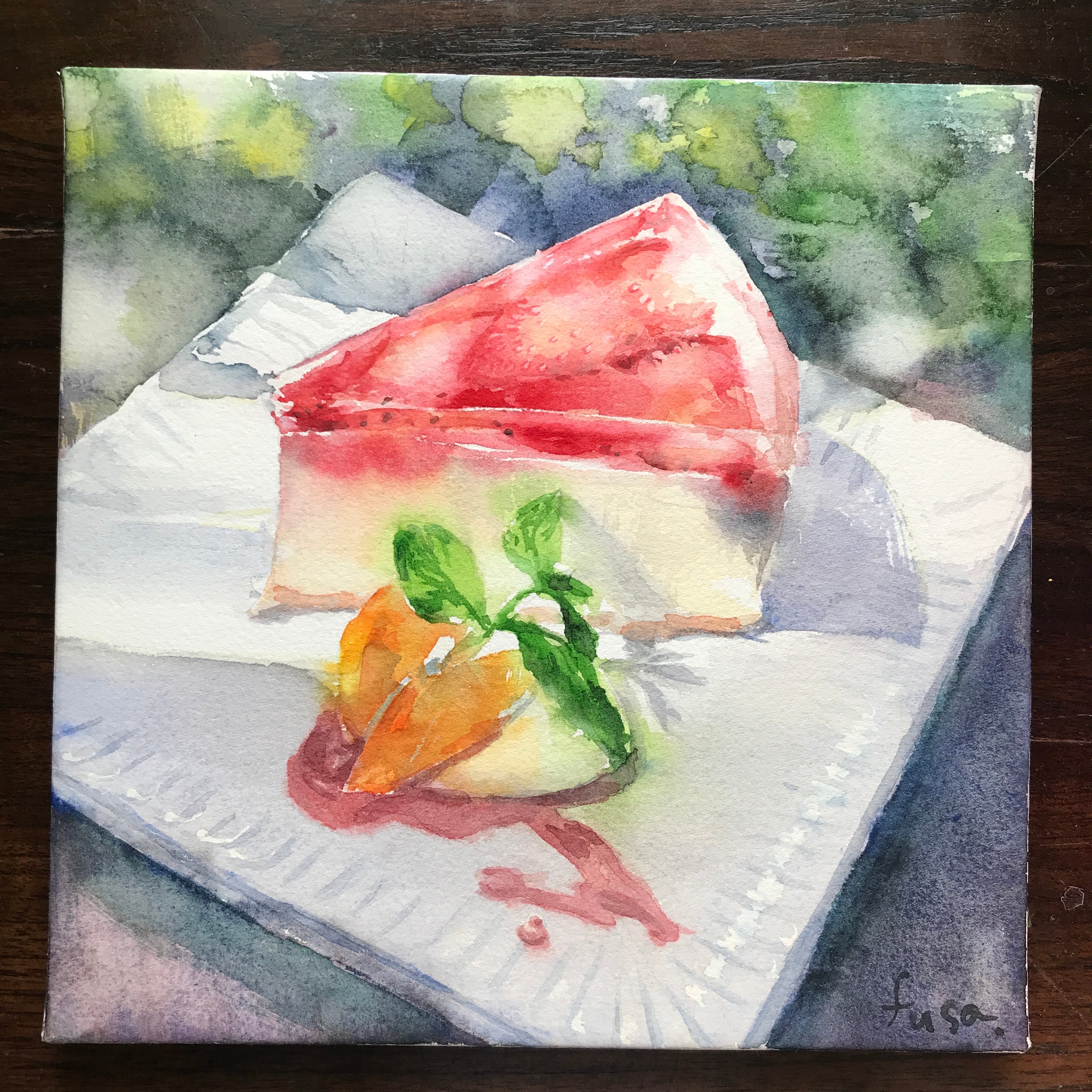 ストロベリーの赤と、チーズケーキの白という完璧な美しさのケーキを描きました。